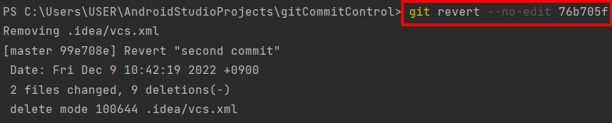 이제 second commit을 revert명령어를 사용해 취소해보겠습니다. --no-edit 옵션은 세부조정을 스킵하는 명령어입니다.